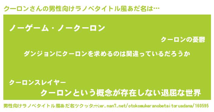 | 女子向けラノベタイトル風あだ名 | 『クーロンの卵を拾いまして』 |
