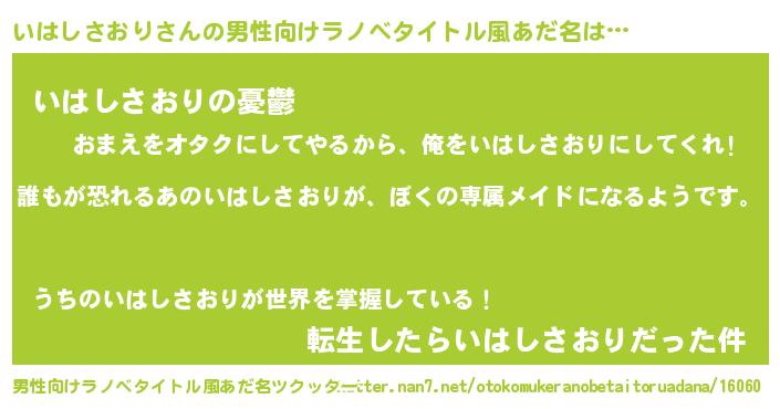 | 女子向けラノベタイトル風あだ名 | 『いはしさおりの契約王妃』 |