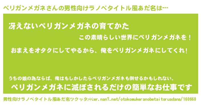 | 女子向けラノベタイトル風あだ名 | 『ペリガンメガネ夫妻のなれそめ』 |