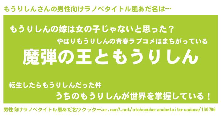 | 女子向けラノベタイトル風あだ名 | 『もうりしんが死なない童話 林檎のもうりしんの診療簿』 |