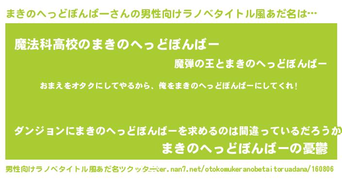 | 女子向けラノベタイトル風あだ名 | 『まきのへっどぼんばー夫妻のなれそめ』 |