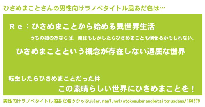 | 女子向けラノベタイトル風あだ名 | 『異世界で失敗しない100のひさめまこと』 |