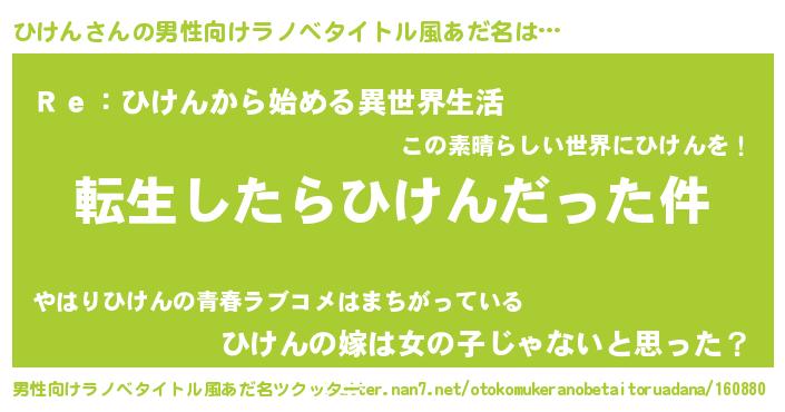 | 女子向けラノベタイトル風あだ名 | 『ひけんの玉の輿計画!』 |