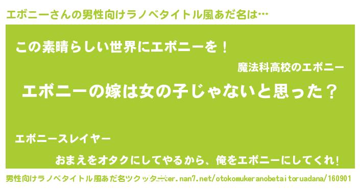 | 女子向けラノベタイトル風あだ名 | 『エボニーの卵を拾いまして』 |