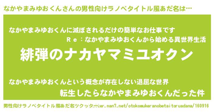 | 女子向けラノベタイトル風あだ名 | 『シンデレラなかやまみゆおくん家の靴箱館』 |
