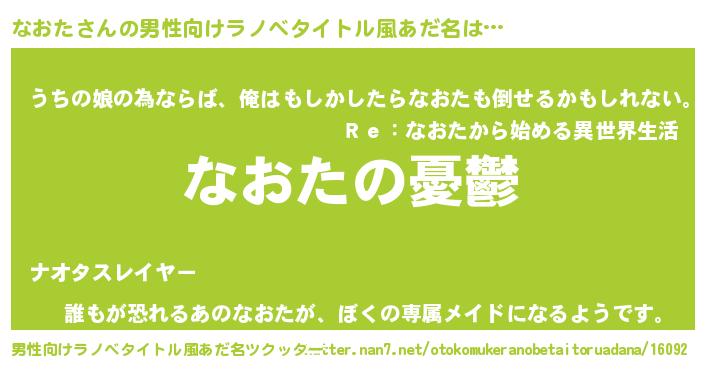 | 女子向けラノベタイトル風あだ名 | 『(仮)なおたのやんごとなき事情』 |