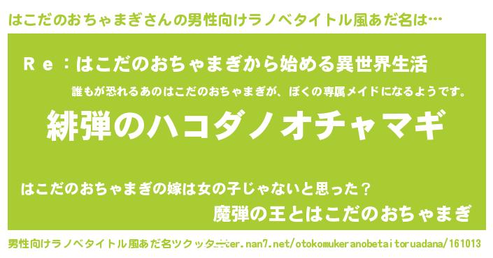 | 胡散臭い通販商品みたいなあだ名 | 『ガンによく効く高麗人参…その名も「はこだのおちゃまぎ」』 |