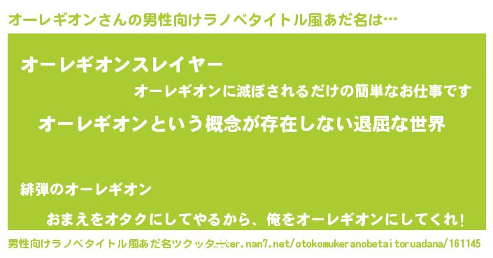 | 胡散臭い通販商品みたいなあだ名 | 『絶対に幸福をもたらす健康食品…その名も「オーレギオン」』 |