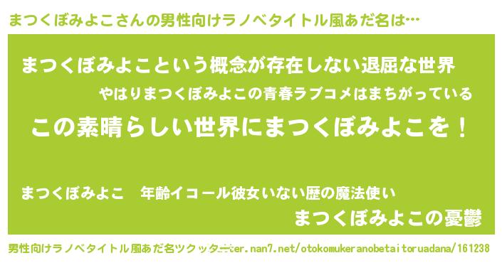 | 女子向けラノベタイトル風あだ名 | 『悪役まつくぼみよこに転生したようですが、知った事ではありません』 |