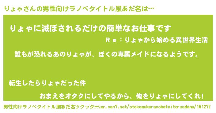 | 女子向けラノベタイトル風あだ名 | 『りょゃの契約王妃』『闇のりょゃ』 |
