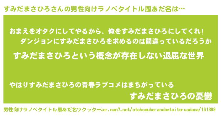 | 女子向けラノベタイトル風あだ名 | 『異世界で失敗しない100のすみだまさひろ』 |