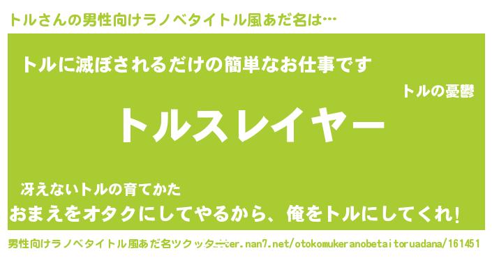 | 女子向けラノベタイトル風あだ名 | 『婚約破棄系悪役トルに転生したので、保身に走りました。』 |