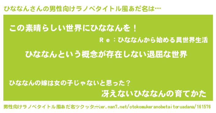 | 女子向けラノベタイトル風あだ名 | 『異世界で失敗しない100のひななん』 |