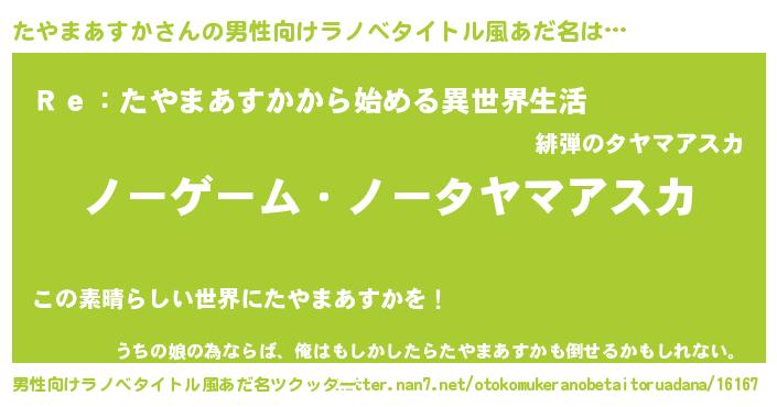 | 女子向けラノベタイトル風あだ名 | 『死神たやまあすかの再婚』 |