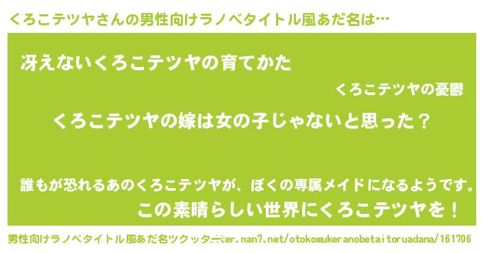 | 女子向けラノベタイトル風あだ名 | 『くろこテツヤの卵を拾いまして』 |