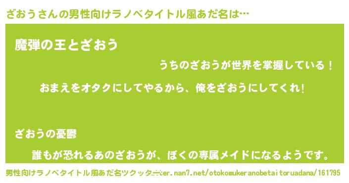 | 女子向けラノベタイトル風あだ名 | 『ざおう夫妻のなれそめ』 |