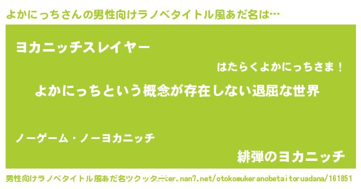 | 胡散臭い通販商品みたいなあだ名 | 『絶対に幸福をもたらす水素水…その名も「よかにっち」』 |