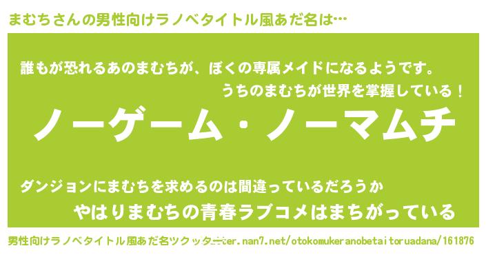 | 女子向けラノベタイトル風あだ名 | 『まむち恋絵巻』『まむちの雑貨屋さん』 |