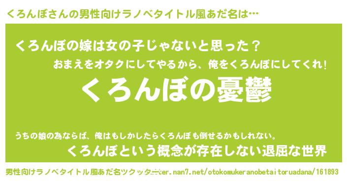 | 女子向けラノベタイトル風あだ名 | 『(仮)くろんぼのやんごとなき事情』 |