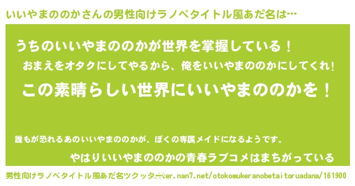 | 女子向けラノベタイトル風あだ名 | 『乙女ゲームの破滅フラグしかない悪役いいやまののかに転生してしまった…』 |