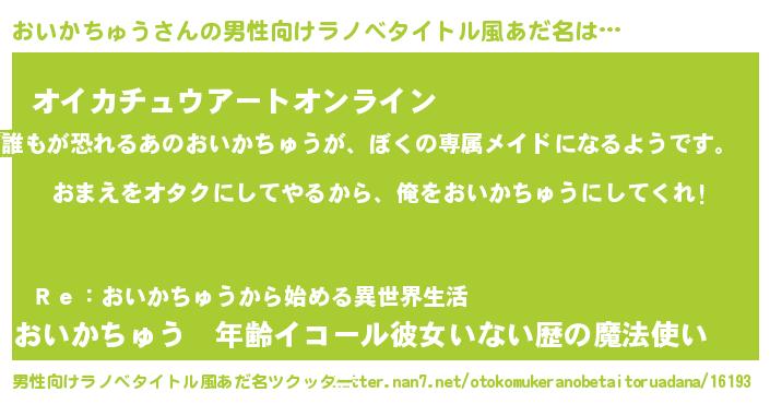 | 女子向けラノベタイトル風あだ名 | 『おいかちゅう夫妻のなれそめ』 |