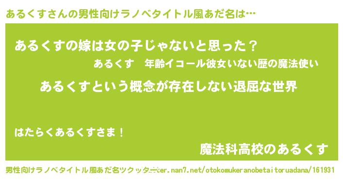 | 女子向けラノベタイトル風あだ名 | 『異世界で失敗しない100のあるくす』 |