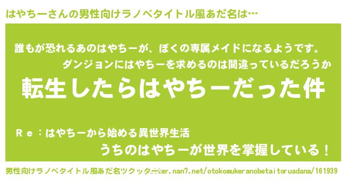 はやちーさんの男性向けラノベタイトル風あだ名をツクッター!