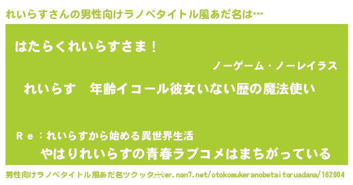 | 女子向けラノベタイトル風あだ名 | 『れいらすの玉の輿計画!』 |