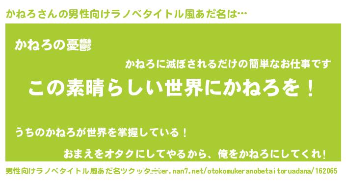 | 女子向けラノベタイトル風あだ名 | 『悪役かねろに転生したようですが、知った事ではありません』 |