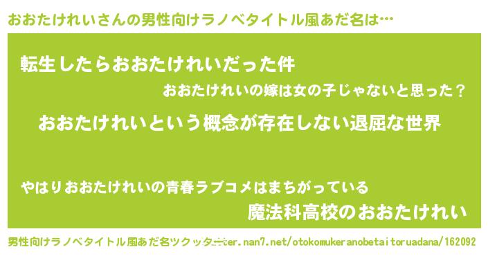 | 女子向けラノベタイトル風あだ名 | 『おおたけれいの契約王妃』 |