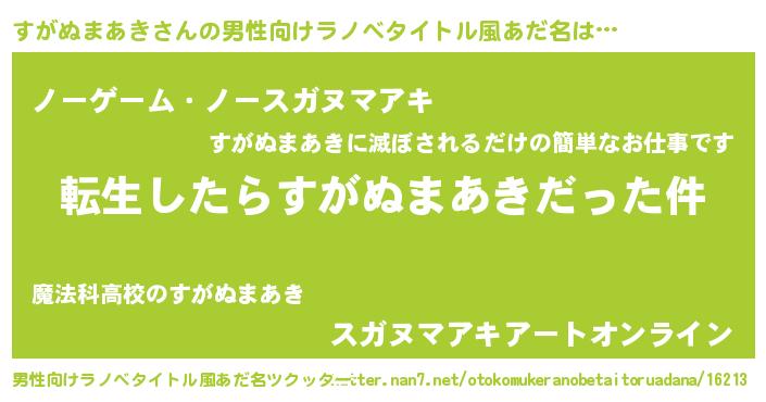 | 女子向けラノベタイトル風あだ名 | 『婚約破棄系悪役すがぬまあきに転生したので、保身に走りました。』 |