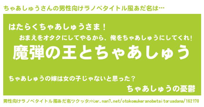 | 女子向けラノベタイトル風あだ名 | 『乙女ゲームの破滅フラグしかない悪役ちゃあしゅうに転生してしまった…』 |