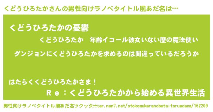 | 女子向けラノベタイトル風あだ名 | 『くどうひろたかの卵を拾いまして』 |