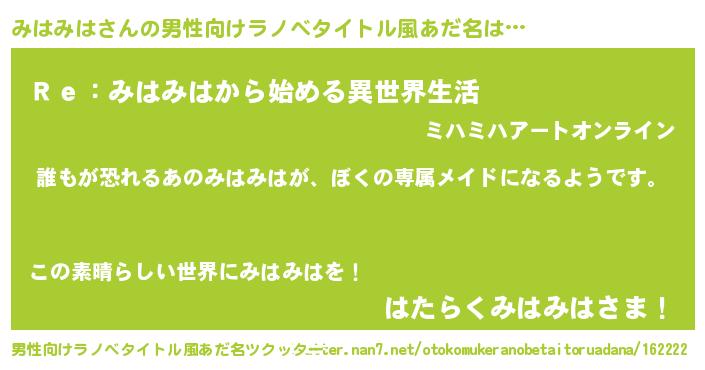 | 女子向けラノベタイトル風あだ名 | 『みはみはの契約王妃』『闇のみはみは』 |