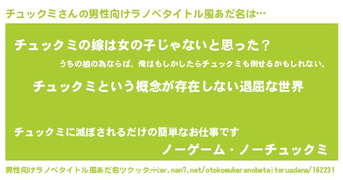 | 胡散臭い通販商品みたいなあだ名 | 『絶対に幸福をもたらす健康食品…その名も「チュックミ」』 |