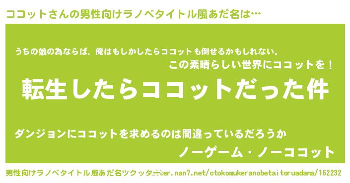 | 女子向けラノベタイトル風あだ名 | 『ココットの玉の輿計画!』 |
