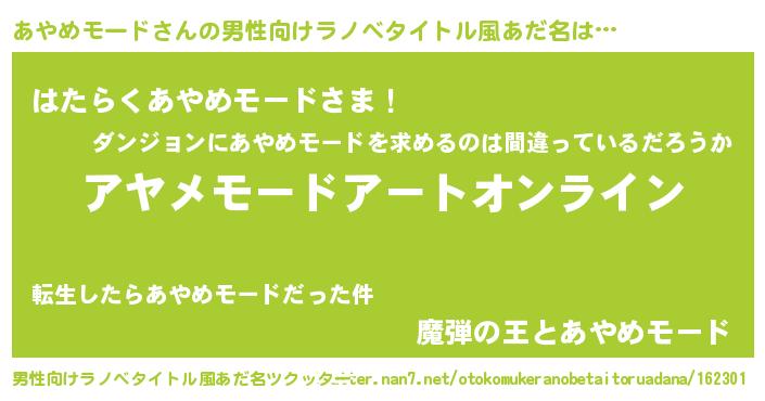 | 胡散臭い通販商品みたいなあだ名 | 『億万長者になれるブレスレット…その名も「あやめモード」』 |