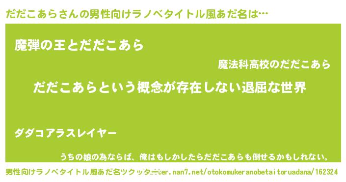 | 女子向けラノベタイトル風あだ名 | 『異世界で失敗しない100のだだこあら』 |