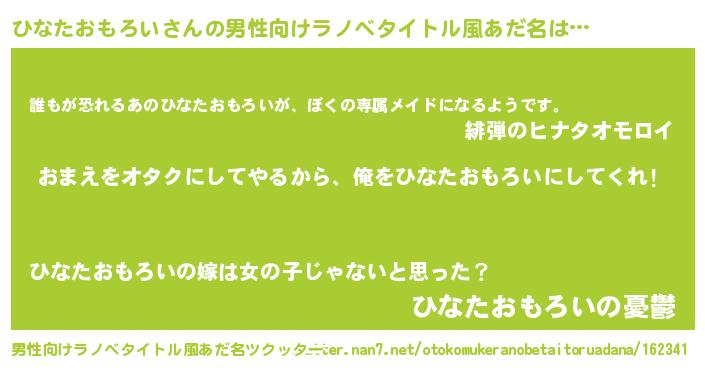| 女子向けラノベタイトル風あだ名 | 『ひなたおもろい夫妻のなれそめ』 |