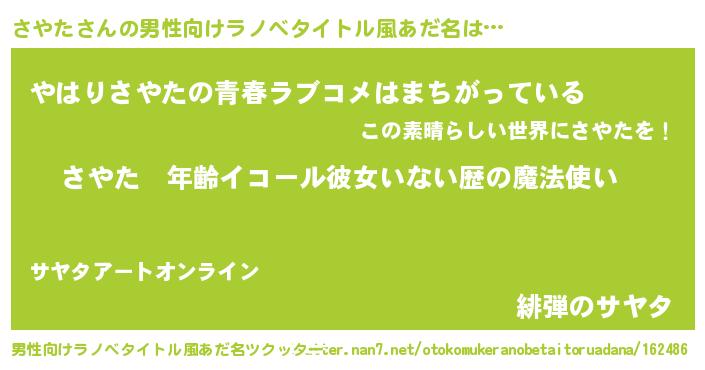 | 女子向けラノベタイトル風あだ名 | 『さやたの玉の輿計画!』 |