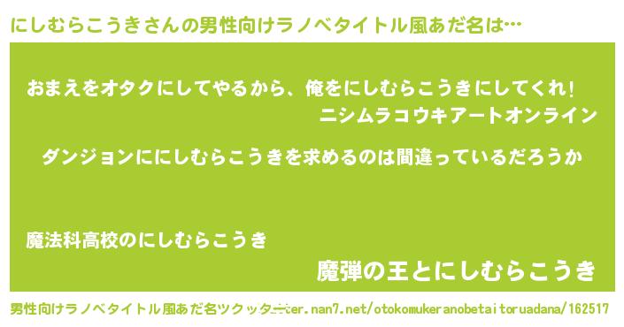 | 女子向けラノベタイトル風あだ名 | 『にしむらこうきは平凡を望む』 |