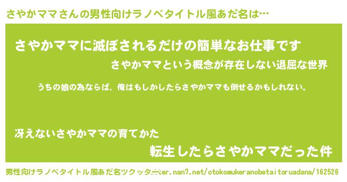 | 女子向けラノベタイトル風あだ名 | 『さやかママ伯爵の花嫁』 |