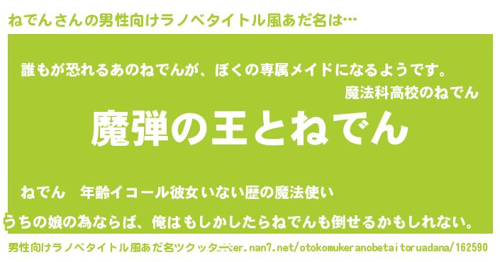 | 女子向けラノベタイトル風あだ名 | 『乙女ゲームの破滅フラグしかない悪役ねでんに転生してしまった…』 |