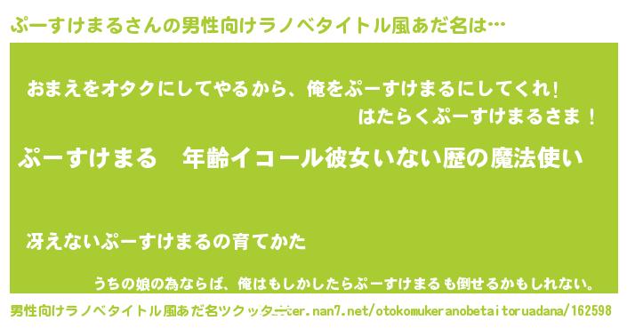 | 女子向けラノベタイトル風あだ名 | 『ぷーすけまるの玉の輿計画!』 |