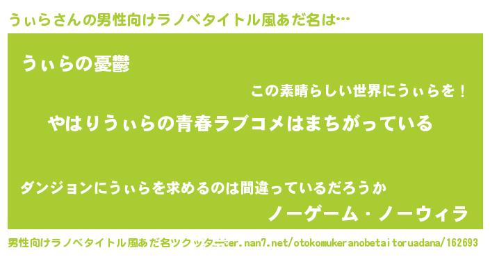 | 女子向けラノベタイトル風あだ名 | 『うぃら伯爵の花嫁』『うぃら恋絵巻』 |
