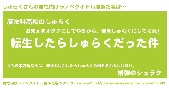 しゅらくさんの男性向けラノベタイトル風あだ名をツクッター!