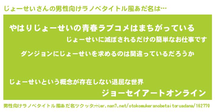 | 女子向けラノベタイトル風あだ名 | 『じょーせいの卵を拾いまして』 |