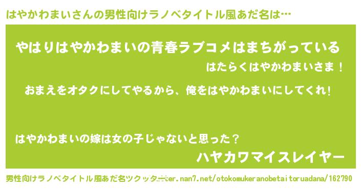 | 女子向けラノベタイトル風あだ名 | 『はやかわまい夫妻のなれそめ』 |