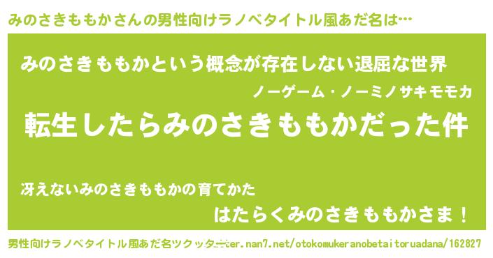 | 女子向けラノベタイトル風あだ名 | 『婚約破棄系悪役みのさきももかに転生したので、保身に走りました。』 |