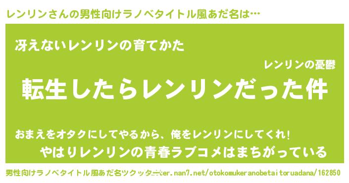 | 女子向けラノベタイトル風あだ名 | 『レンリンの玉の輿計画!』 |